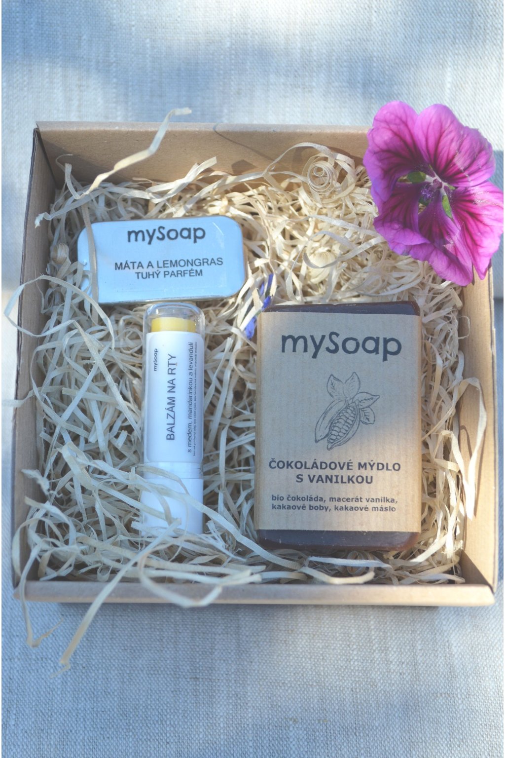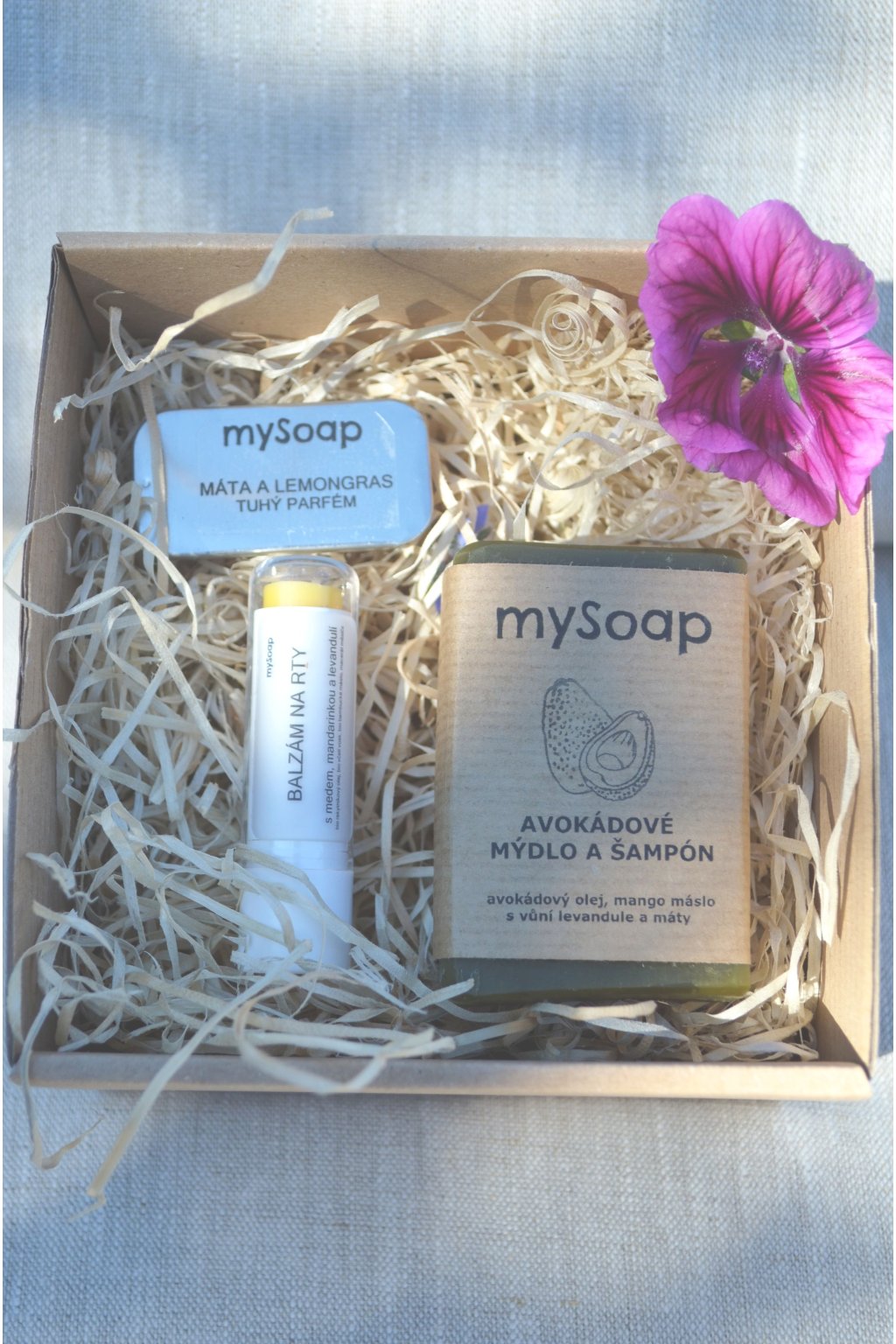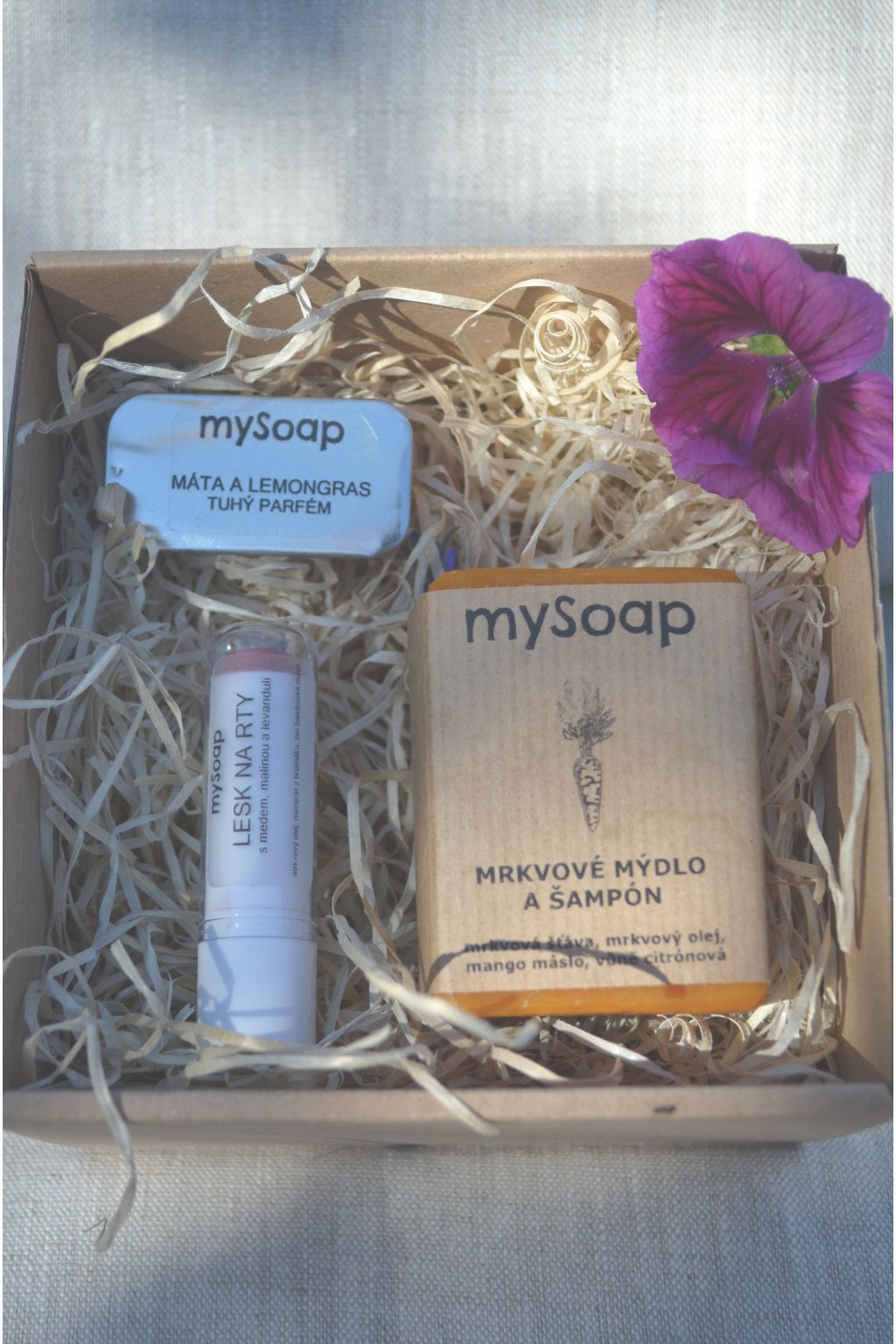 Sada obsahuje: | tuhé mýdlo, tuhý parfém, pomádu na rty nebo lesk na rty |
