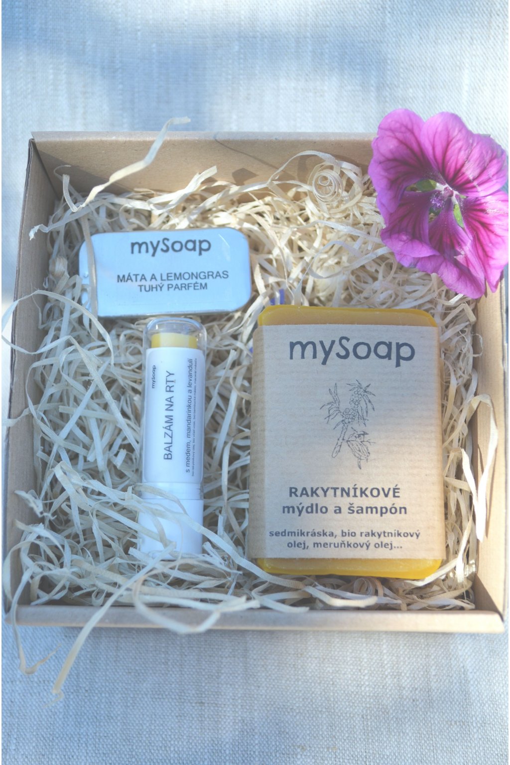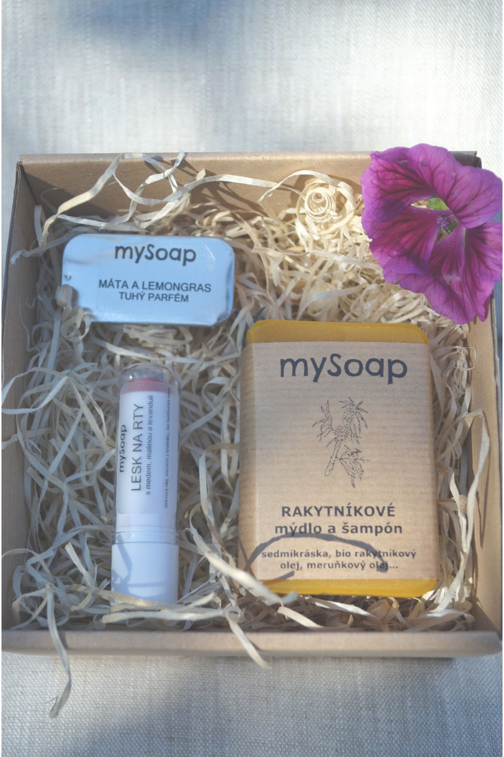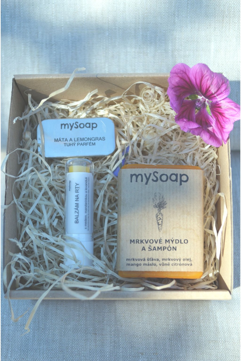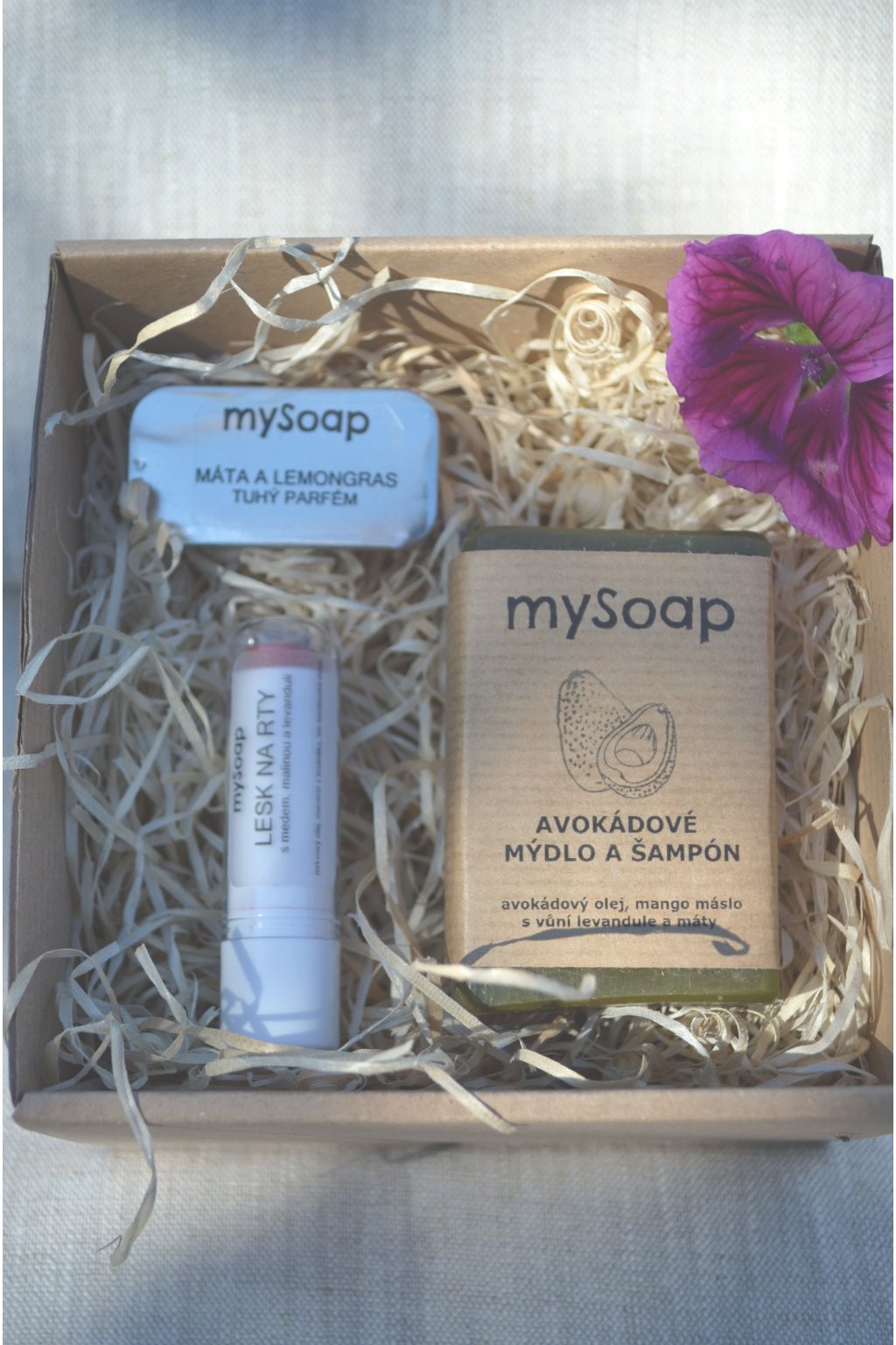 Sada obsahuje: | tuhé mýdlo, tuhý parfém, pomádu na rty nebo lesk na rty |